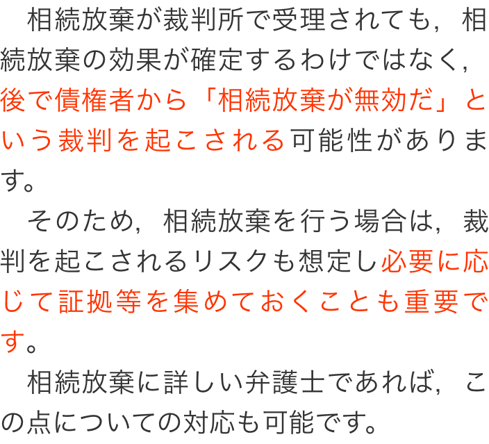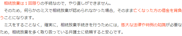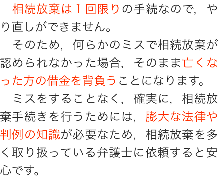 例えば書類等の不備で相続放棄が認められないと、再度手続きをやり直すということができないため、亡くなった方に借金があった場合にはそれをご自身が背負うことになってしまいます。