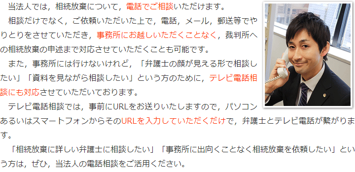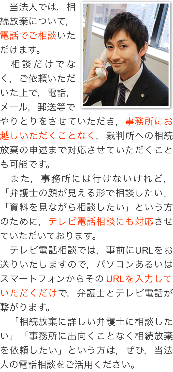 トップその他相続放棄の電話相談・テレビ電話相談 階層構造▼ その他(目次) 相続放棄の電話相談・テレビ電話相談 その他(目次)その他トップ共通バナー※消さない心グループニュース相続放棄の電話相談・テレビ電話相談弁護士費用(詳細)費用の安さにこだわる理由お客様相談室お役立ちリンク集関連リンク集プライバシーポリシー 受付時間 平日 9時~21時、土日祝 9時~18時 夜間・土日祝の相談も対応します (要予約) 所在地 〒111-1111 ●町●●建物● 0120-41-2403 お問合せ・アクセス・地図