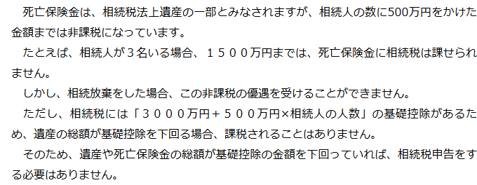 相続放棄と生命保険に関するQ&AQ相続放棄をすると死亡保険金を受け取ることはできなくなりますか?Q相続放棄をして死亡保険金を受け取った場合、相続税申告は必要ですか?Q相続放棄をした場合、死亡保険金の非課税枠は使えますか? Q相続放棄をすると死亡保険金を受け取ることはできなくなりますか?AQ相続放棄をして死亡保険金を受け取った場合、相続税申告は必要ですか?AQ相続放棄をした場合、死亡保険金の非課税枠は使えますか?A Q&A(目次)Q&Aトップ相続放棄と生命保険に関するQ&A 受付時間 平日 9時~21時、土日祝 9時~18時 夜間・土日祝の相談も対応します (要予約) 所在地 〒111-1111 ●町●●建物● 0120-41-2403 お問合せ・アクセス・地図